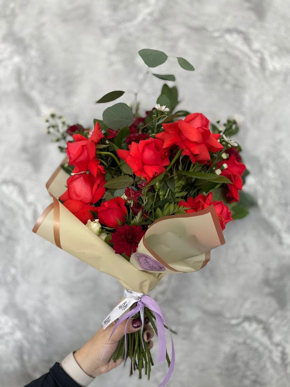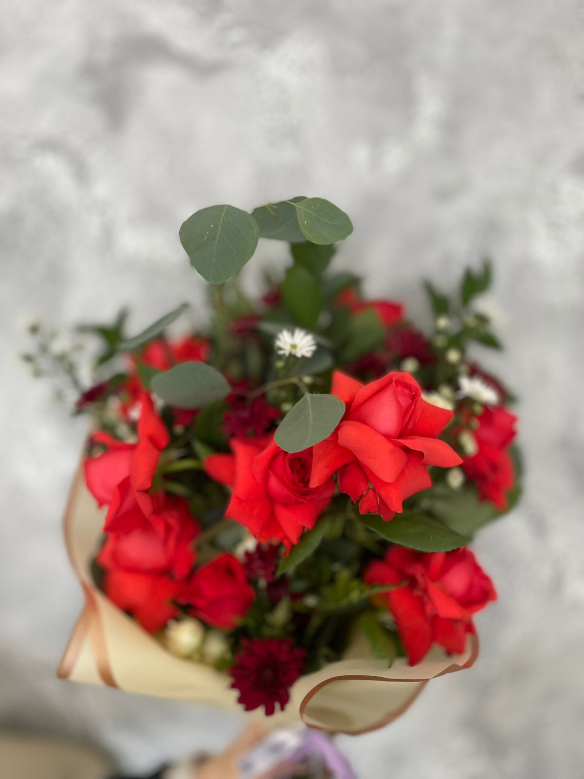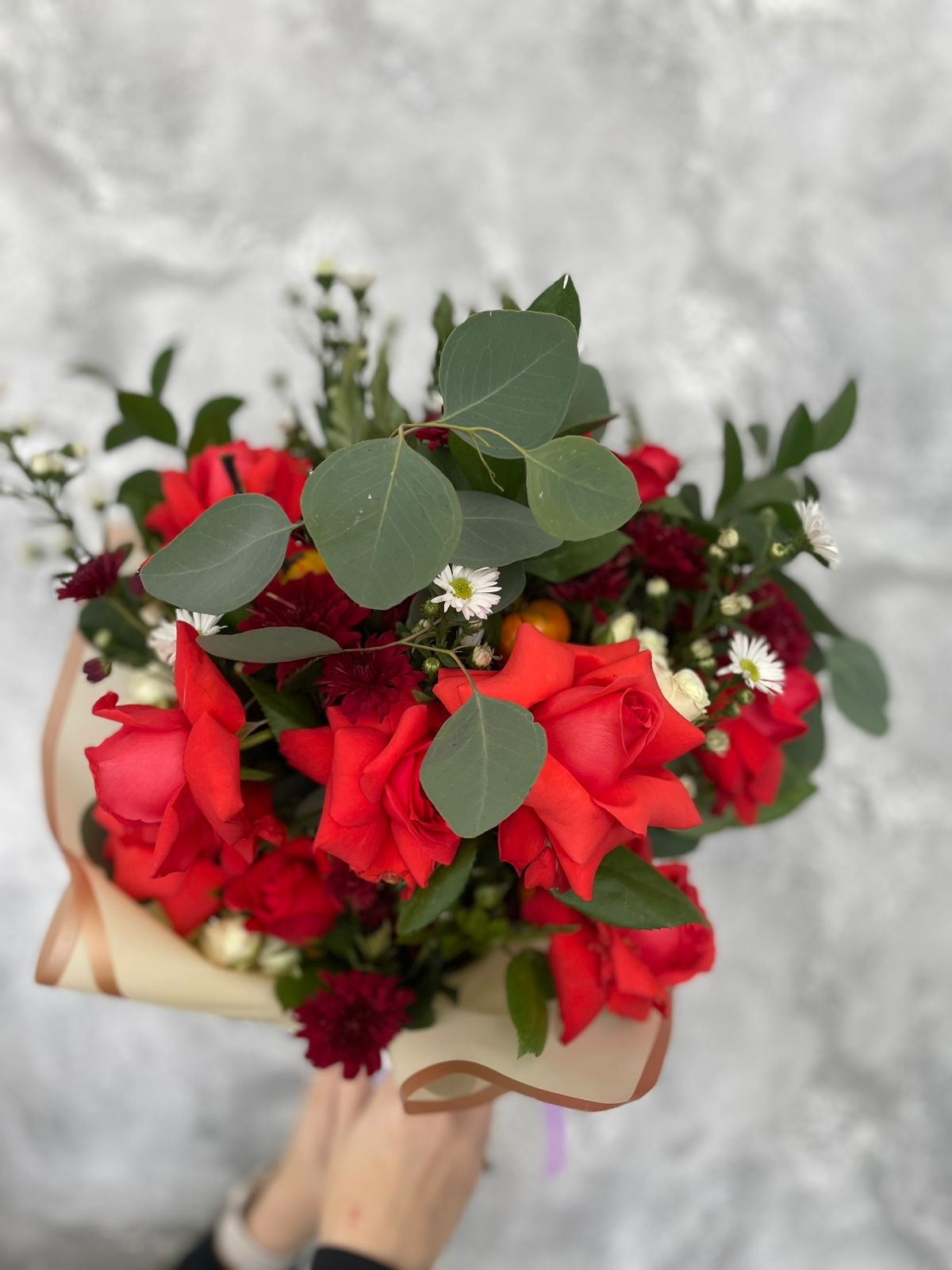 Diseño floral a base de combinación de rosas rojas, margaritas vino y montecasinos blancos, con follajes verdes mixtos.