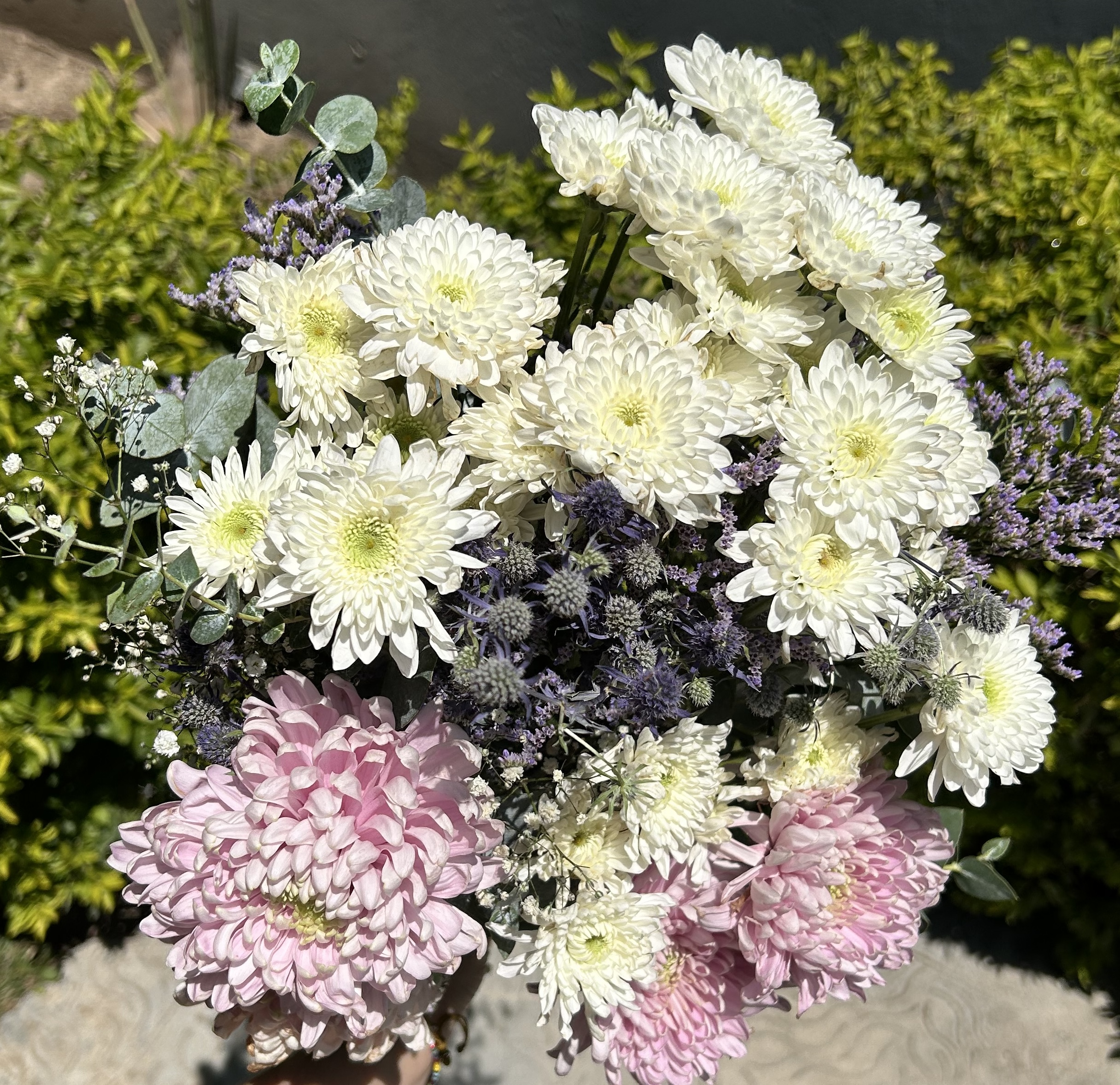 Diseño floral a base de roxanas, margaritas, claveles y eringium y limonium.